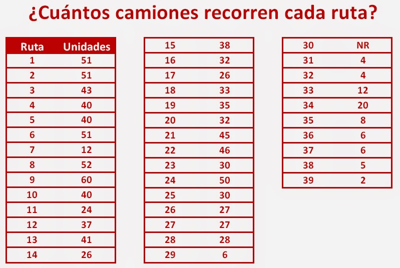La distribución entre las 39 rutas, según la SCT, resulta dispar: mientras sólo seis rutas cuentan con 50 unidades o más (la 9 con 60, la 8 con 52, con 51 la 1, la 2 y la 6 y con 50 la ruta 24), hay ocho que trabajan con menos de 10 unidades: la 35 con 8, con 6 la 29, la 36 y la 37, la 38 con 5, con 4 la 31 y la 32 y con sólo dos unidades la ruta 39.