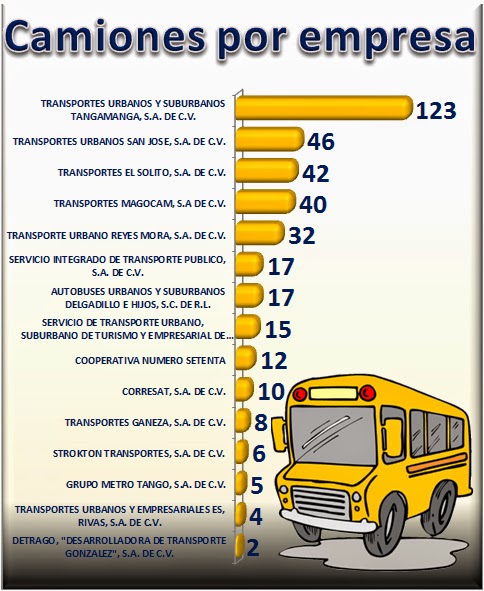 Entre las 15 empresas que aparecen en el padrón del transporte público, ocho cuentan con unidades que rebasan la antigüedad permitida por la ley: Transportes Urbanos y Suburbanos Tangamanga, S.A. de C.V. de sus 123 camiones, 17 tienen más de diez años; Transportes Urbanos San José, S.A. de C.V. de sus 46 vehículos, 5 rebasan la antigüedad permitida.Transportes Magocam, S.A de C.V. aparece con 40 camiones, de los cuales 4 tienen más de diez años; Transportes Ganeza, S.A. de C.V. está reportada con 8 camiones, 3 de más de diez años; Servicio Integrado de Transporte Público, S.A. de C.V. de 17 unidades, dos superan la antigüedad lega y con una unidad más antigüa de lo permitido, aparecen Transportes Urbanos y Empresariales Rivas, S.A. de C.V. que cuenta con 4 camiones, Strokton Transportes, S.A. de C.V. que tiene 6 y