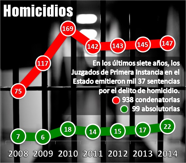 Mientras tanto, en los últimos siete años, los Juzgados de Primera Instancia en el Estado emitieron mil 37 sentencias por el delito de homicidio, según la misma respuesta proporcionada por el Poder Judicial. En 938 casos los responsables fueron condenados, en tanto que 99 resultaron absueltos. Es decir, casi uno de cada 10 acusados salió libre.