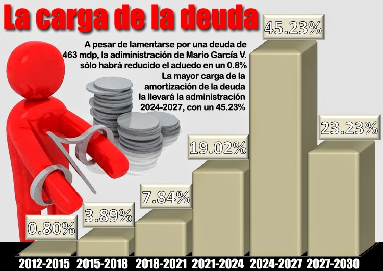 Aunque uno de los argumentos para justificar la falta de obras durante la administración municipal de Mario García Valdez fue la deuda pública que heredó de su antecesora, Victoria Labastida, el alcalde heredará a la siguiente administración el 99.2 por ciento de esos compromisos, como efecto de la reestructuración que le autorizó el Congreso del Estado en diciembre de 2013.