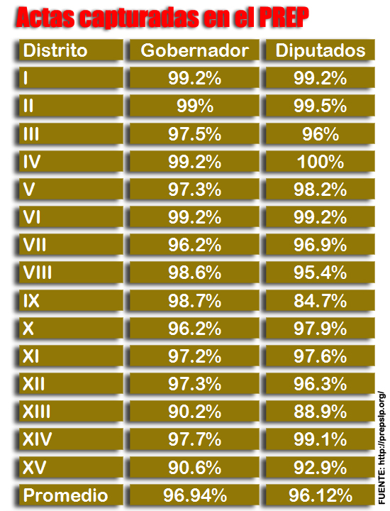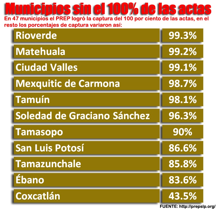En 47 de los 58 municipios del estado, el PREP logró la captura de la totalidad de las actas de escrutinio de las casillas. Sólo en once municipios (Rioverde, Matehuala, Ciudad Valles, Mexquitic de Carmona, Tamuín, Soledad de Graciano Sánchez, Tamasopo, San Luis Potosí, Tamazunchale, Ébano y Coxcatlán) no se logró incorporar la totalidad de las actas.